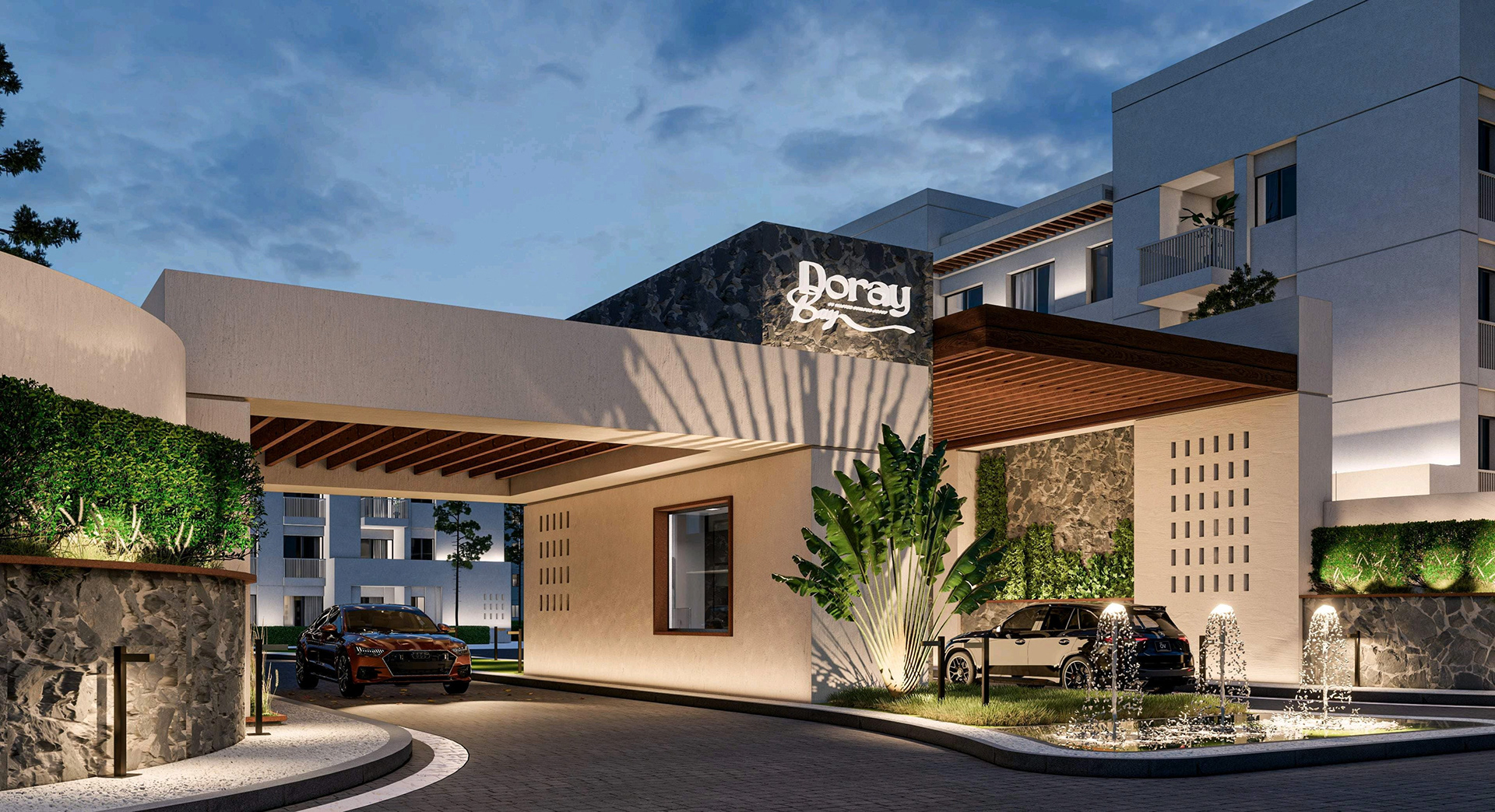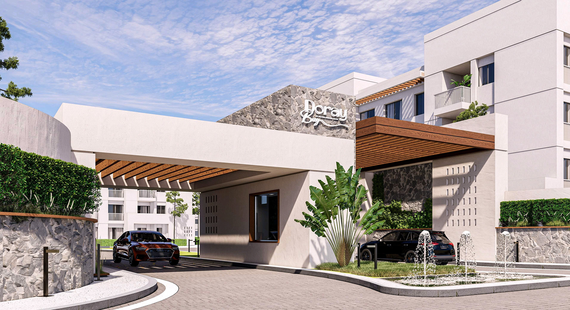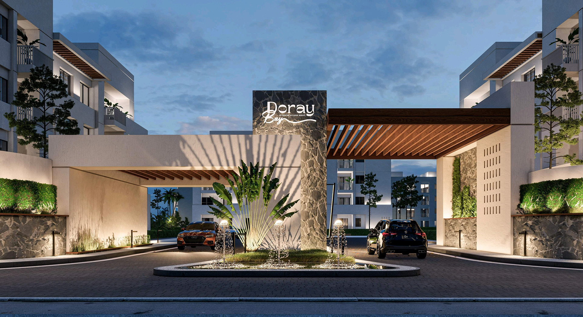 Presenting the striking entrance design for "Gate A" of the "Doray Bay" residential compound, a project for MBG Master Builder Group Development. This facade design embodies modern elegance and a welcoming aesthetic, setting the tone for the entire development. The design features a sophisticated interplay of materials, including natural stone accents and warm wood-look soffits, complemented by contemporary architectural lines. Integrated landscaping with mature trees and elegant water features further enhances the arrival experience, creating a sense of tranquility and prestige. The thoughtful lighting design ensures the entrance is both inviting and secure, highlighting the architectural details both day and night. This project showcases our expertise in creating impactful and memorable entrance statements for residential communities. Suggested Hashtags: * #Architecture * #FacadeDesign * #EntranceDesign * #ResidentialDesign