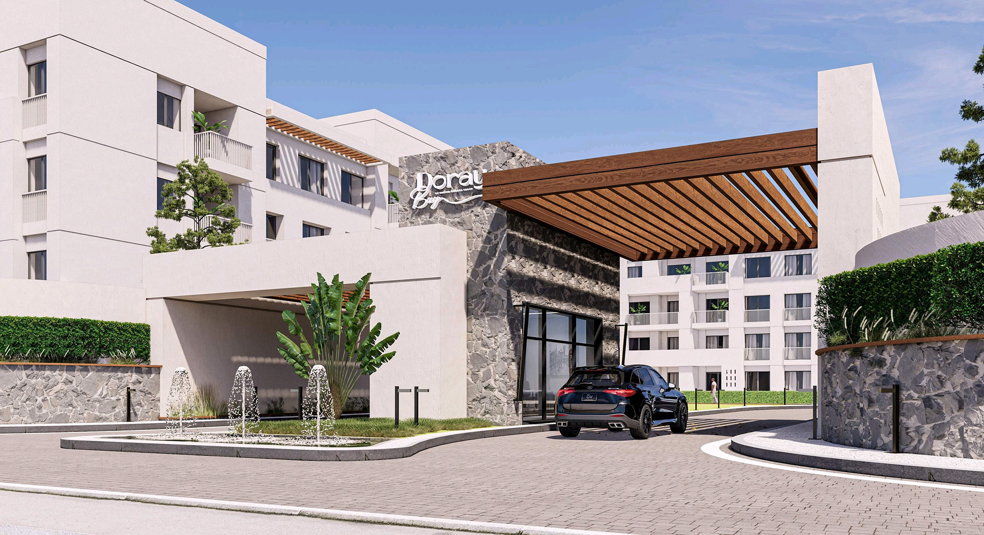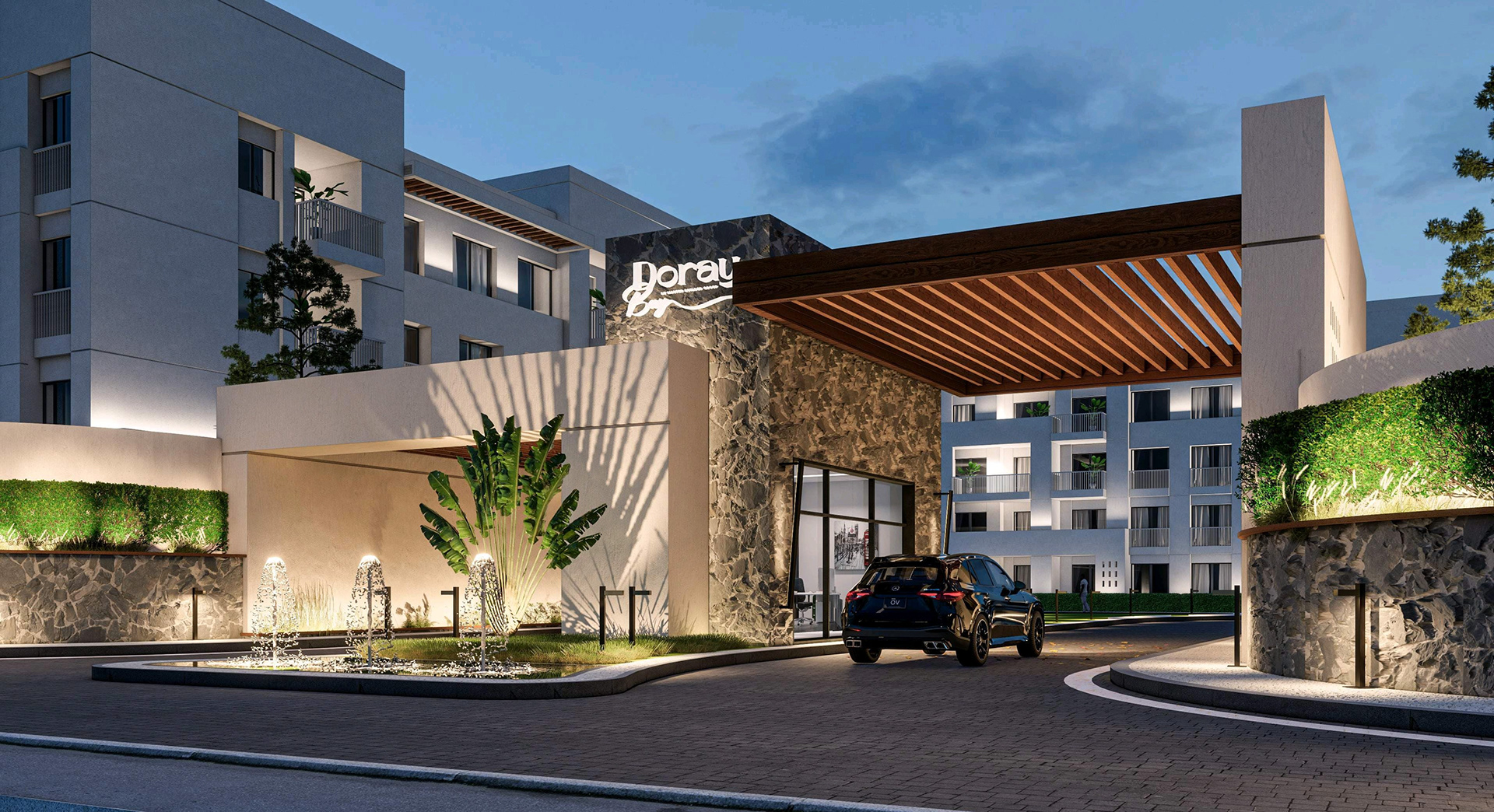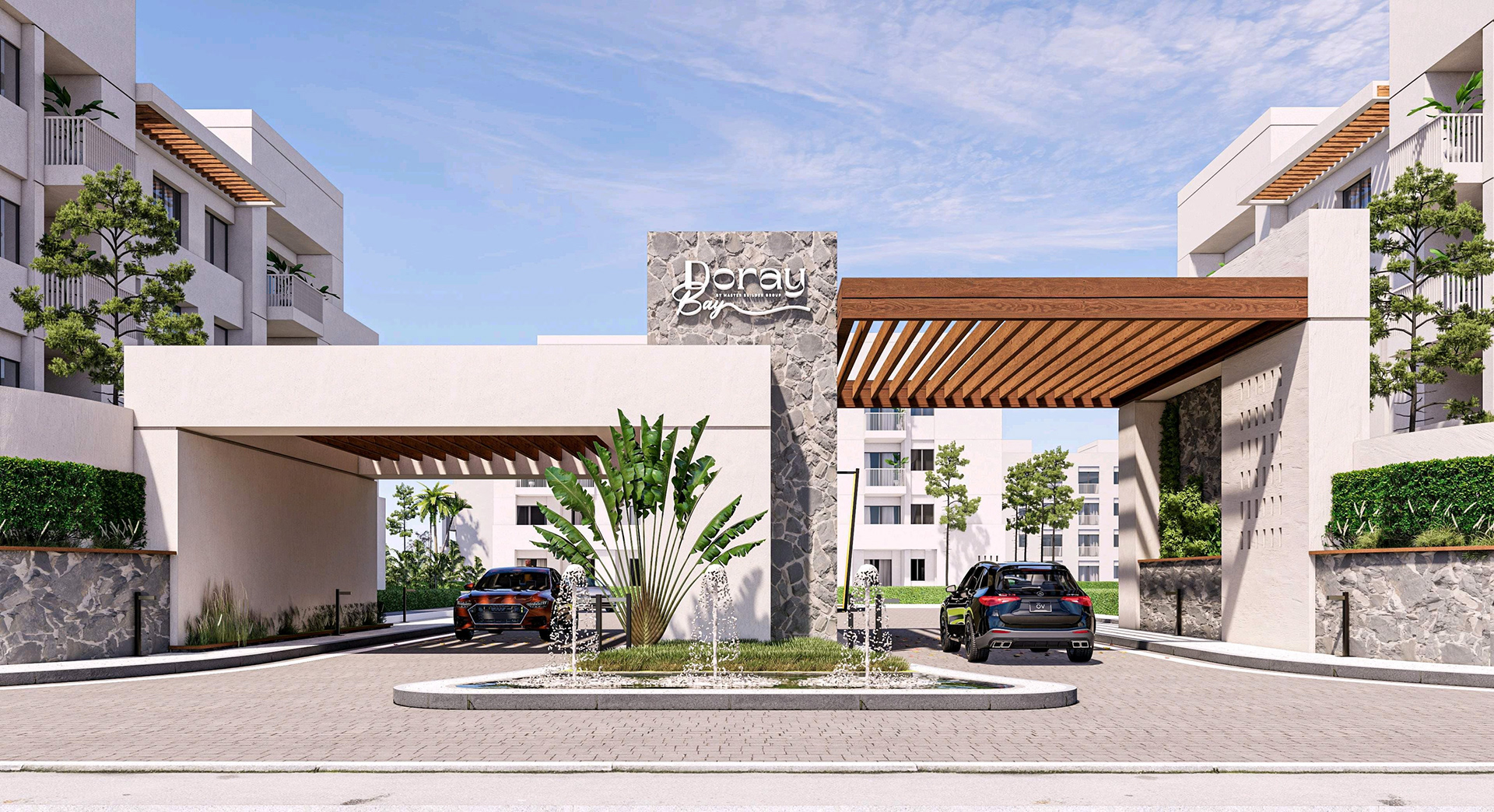 Presenting the striking entrance design for "Gate A" of the "Doray Bay" residential compound, a project for MBG Master Builder Group Development. This facade design embodies modern elegance and a welcoming aesthetic, setting the tone for the entire development. The design features a sophisticated interplay of materials, including natural stone accents and warm wood-look soffits, complemented by contemporary architectural lines. Integrated landscaping with mature trees and elegant water features further enhances the arrival experience, creating a sense of tranquility and prestige. The thoughtful lighting design ensures the entrance is both inviting and secure, highlighting the architectural details both day and night. This project showcases our expertise in creating impactful and memorable entrance statements for residential communities. Suggested Hashtags: * #Architecture * #FacadeDesign * #EntranceDesign * #ResidentialDesign